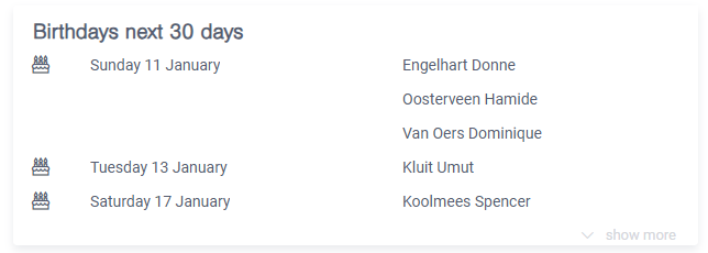 As a personal data administrator, you will see an overview of employees whose birthdays are coming up (within the next 30 days) on your homepage.