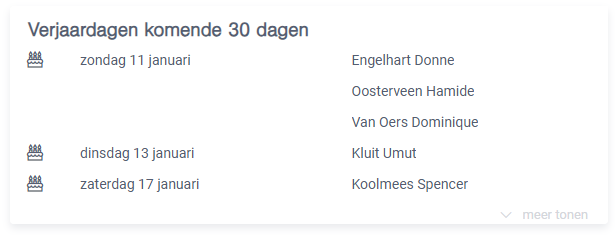 Als personalia beheerder krijg je op je homepage een overzicht van de medewerkers die binnenkort (de komende 30 dagen) zullen verjaren.